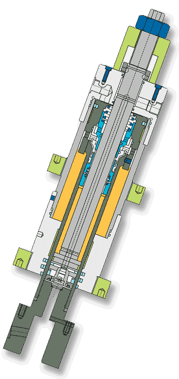 | In a typical hydraulic press, the application fixes the duration of the work portion of the extension stroke. The only way to reduce the overall hydraulic cycle time is to increase the speeds of the non-working advance and retraction strokes. But to do this with conventional cylinders, large volumes of fluid must be moved at low pressure. This can be accomplished with multiple pumps, special hi-lo pumps, pre-fill valves, regenerative retraction arrangements (using 2:1 area ratios), and other special external circuits.